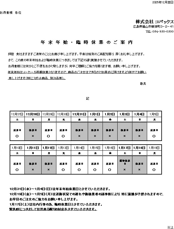 年末年始休業・臨時休業のご案内